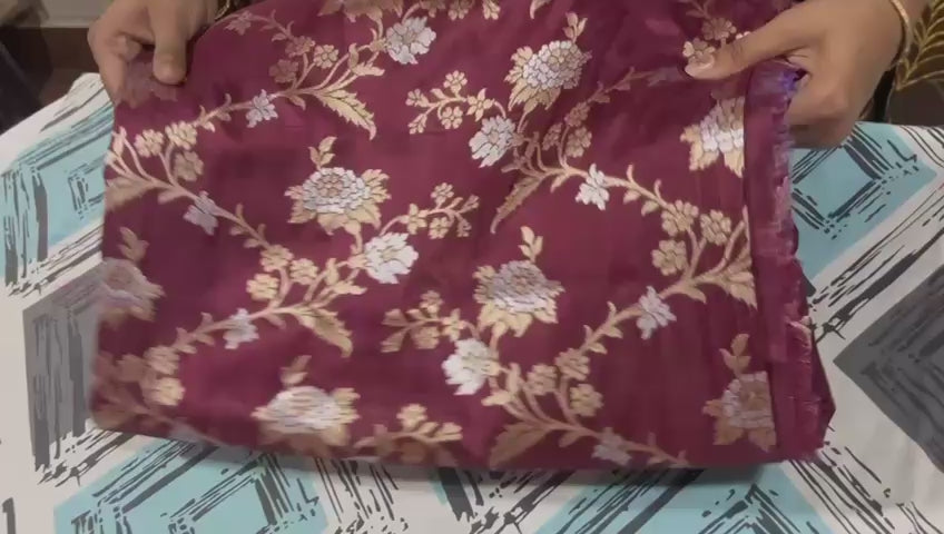 Be the embodiment of grace with our Handloom Brown Pure Katan Silk Banarasi Saree. This exquisite Indian creation is handwoven, featuring the Kadwa weaving technique where the motifs are woven together with the saree. The saree reveals a  floral jaal in gold zari giving this six yards its true elegance.